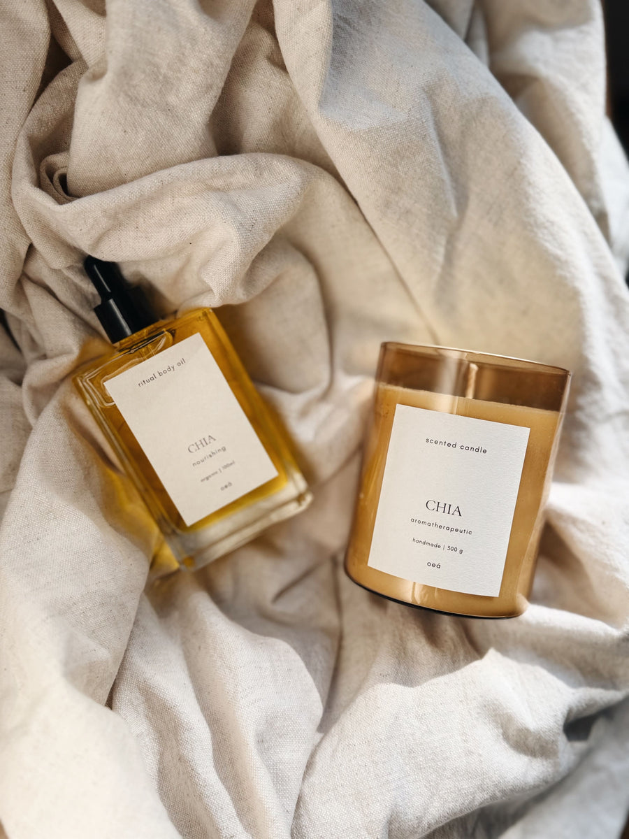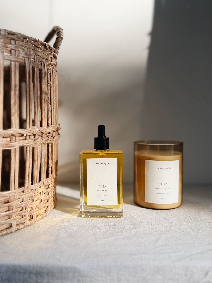 Schenke sinnliche Auszeiten: Unser CHIA Ritual Set vereint das luxuriöse CHIA Ritual Body Oil mit der dazu passenden Duftkerze im Glas – eine harmonische Kombination aus Pflege und Duft, ideal für besondere Momente, Weihnachtsgeschenke oder Self-Care-Rituale im Winter.